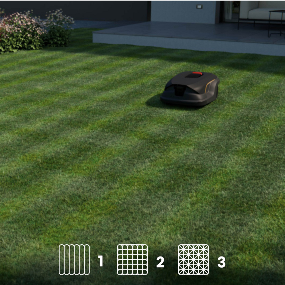 Organizované sečení pro dokonale plynulé pruhy - Robotická sekačka vytváří plynulé pruhy bez stop, s optimálním překryvem, který zabrání vynechaným stéblům, a při otáčení zanechává trávník neporušený. Můžete si vybrat paralelní, šikmý nebo mřížkový vzor – i v různých zónách – a díky precizní správě obvodu si užít čisté sečení až ke krajům trávníku.
