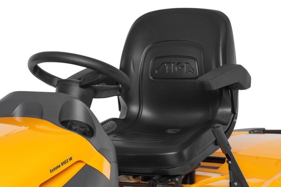 Zahradní traktor STIGA Estate 9102 W je vybaven dvouválcovým motorem Honda GXV 690 o objemu 688 ccm. Nová kapota je opatřena výkonnými předními LED světlomety a novou nádrží na palivo s vnějším víčkem umožňujícím snadný přístup. Žací ústrojí o šířce 102 cm se dvěma noži má 4 pomocná kolečka; výšku střihu je možné nastavit do 7 různých poloh od 30 do 90 mm. Nože jsou aktivovány pomocí elektromagnetické spojky pouhým stisknutím tlačítka. Model Estate 9102 W umožňuje sběr travní hmoty do sběrného zásobníku o objemu 320 litrů nebo mulčování při použití mulčovací záslepky STIGA Multiclip. Barevný displej o úhlopříčce 5,5" umožňuje rychlé a snadné sledování nastavení pomocí intuitivních ikon. Displej je také vybaven funkcí Best Cutting Zone, aby byl zajištěn nejlepší sekací výkon při správné rychlosti. Praktická funkce udržování stálé rychlosti umožňuje nastavení stálé rychlosti. Zvýšený volant s měkkým potahem a sedačka s opěrkami rukou poskytuje pohodlné řízení. mulčovací sada se prodává samostatně.